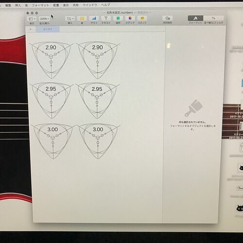 色々とオリジナルのピックを作っていましたが、 ようやく形と厚さが決まってきたのでここらへんでちゃんと作ってみることにしました。 常に同じ物が作れる様テンプレートを作ります。 まずはパソコンで形を描いて・・・ シール用紙に印刷したら、 0.5mm厚の…