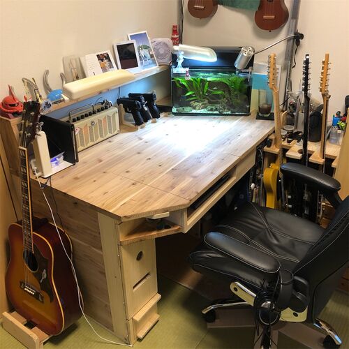 夏頃から目論んでいた机周りの整理を実行してみました。 整理してると机から作り直したくなってしまったので結局作ってみました (*´ω`*) 全体の様子。 右はメタルラックを流用しているので作ったのは天板周りと左側。 コチラは左側。手前の角を切り落として…